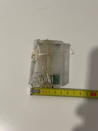 Guirnalda de luces LED blancas ideal para decoración navideña en interiores. Funciona a pilas, por lo que no necesita enchufe y se puede colocar fácilmente en cualquier espacio. Perfecta para decorar: • Árbol de Navidad • Estanterías, mesas o cabeceros • Ventanas o rincones del hogar Características: • Longitud del cable: 3,5 metros • Luz LED color blanco • Funcionamiento a pilas • Bajo consumo • Uso interior • Estado: buen funcionamiento (ver foto) Se vende tal como aparece en las imágenes.