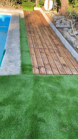 Conjunto de césped artificial de buena calidad y tarima de madera. - Césped de color verde intenso. - Tarima de madera en color marrón.