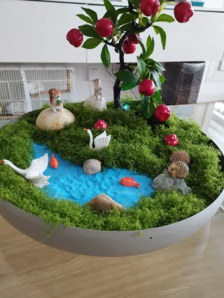 Precioso centro de mesa con un diseño de paisaje en miniatura. - Incluye figuras de animales y elementos decorativos. - Base con césped artificial y estanque. - Árbol decorativo con frutos rojos.