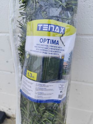 Seto artificial Tenax Optima, ideal para ocultación en jardines. Fácil de instalar. - Medidas: 1.5 metros de alto por 3 metros de largo. - Compuesto por flejes de plástico sobre malla de alambre. - Proporciona privacidad y decoración.
