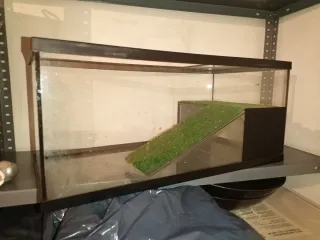 Tortugera de cristal con rampa de césped artificial y zona seca. - Rampa con superficie de césped artificial. - Zona seca elevada.