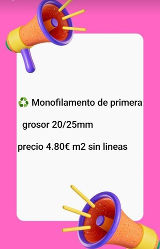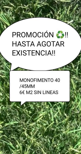 Promoción‼️ Monofilamento de primera calidad 20/25mm Precio 4.80€ m2 sin lineas Monofilamento de primera calidad 30mm Precio 5.20€ m2 sin líneas,más una gran variedad de modelos,precios y grosores. Adquiera el mejor césped artificial europeo a los mejores precios y condiciones. 🚐Se lo llevamos a casa 💵Pagué a la entrega de su pedido 🕋Venta al público en nave ☎️695718440 más información,videos ,fotos , presupuesto..