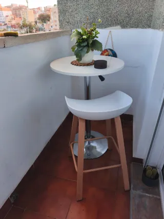 Conjunto de mesa alta y silla - Mesa redonda con base metálica. - Silla con asiento blanco y patas de madera.