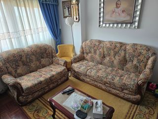 Conjunto de dos sofás tapizados en tela de flores beige y marrón con estructura de madera. El sofá de 2 plazas y el sofá de 3 plazas presentan un diseño clásico y elegante. - Sofá de 3 plazas. - Sofá de 2 plazas. - Patas de madera. 2 plazas, con medidas 139 cm Largo 94 cm Ancho 94 cm Alto 3 plazas, con medidas 187cm Largo 94 cm Ancho 94 cm Alto Sofa en buen estado, se vende por cambio. Solo recogida no se hacen envios. Se vende juego completo o por separado, Juego Completo 350€ Separado 2 plaza 150€ 3 plazas 200€