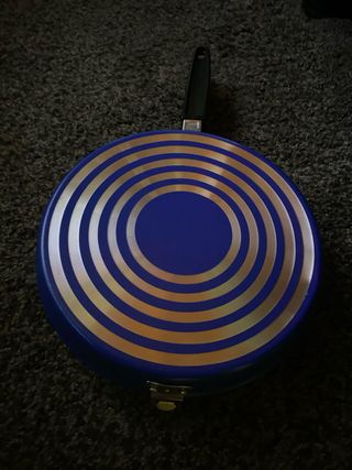 Perfecta sartén de cocina, prácticamente nueva. Es de color azul y plateado, con un diseño circular muy elegante entre los otros 2 productos siguientes - Ideal para cocinar una gran variedad de platillos - Superficie antiadherente - Mango ergonómico de agarre cómodo etc ... Vendo suelta la salten azul 6