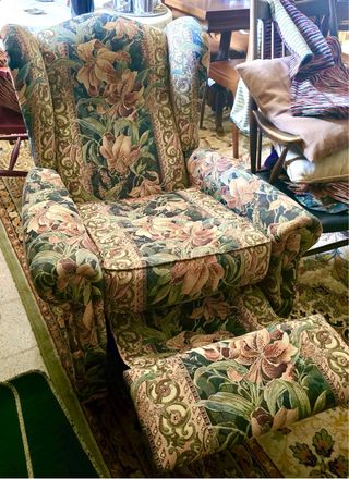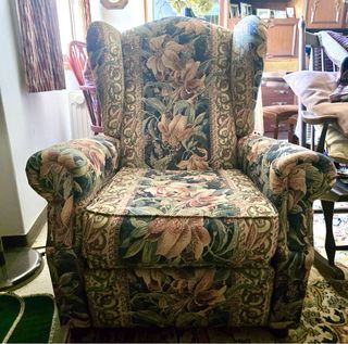 Sillón orejero estampado en tonos tostados. Se puede reclinar para mas fácil descanso, incluso se desliza para levantar los pies. Sus medidas son 99cm de alto, 84cm de ancho y 78cm plegado y 140cm reclinado. Ideal tanto para salón como para zona de descanso de habitación. Está en perfecto estado.
