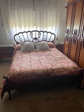 Cama de matrimonio vintage en madera muy trabajada, mide 140cm de ancho x 185 de largo x 31 cm de alto. El cabezal de alto 110cm x 155ancho y fondo 3,5cm. 2 mesillas de noche con 3 cajones y tiradores en oro oscuro, mármol en la parte superior. Una mesilla tiene una tara solucionable en el cajón inferior como se ve en la foto, miden 54cm de ancho x 37 cm de fondo x 62cm de alto. La cómoda tiene 6 cajones y marmol también en la parte superior. sus medidas son 116 cm de ancho x 46cm de fondo x 73cm de alto. El espejo es redondo con un diámetro de 75cm y 5 cm de fondo.