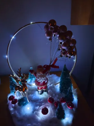 Adorno navideño hecho a mano, perfecto para dar un toque especial a tu hogar durante las fiestas. - Diseño único con figuras. - Base con nieve artificial. - Luces LED integradas.