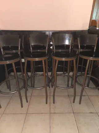 Conjunto de ocho sillas de barra con un diseño moderno y elegante. - Estructura robusta de metal. - Asientos cómodos y resistentes. - Ideales para barras de cocina o bares. Se venden las 8 sillas por 250€. Ideales para utilizar así o incluso restaurarlas por poco precio. Se pueden venir a ver en Chantada.