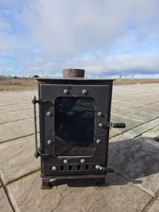 Chimenea de leña con dos tramos de tubo. Junta de la puerta cambiada y cristal puerta nuevo. Puede usarse perfectamente, solo tiene un poco de óxido. - Color negro. - Fabricada en metal. A recogerla en Albalat dels tarongers.