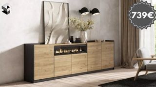 Mueble de TV Anaya con chimenea integrada. Diseño moderno y funcional. - Acabado en madera y detalles en piedra. - Estructura metálica. - Incluye chimenea.