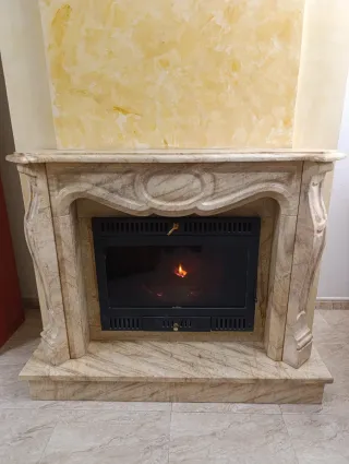 Elegante chimenea fabricada en mármol de tonalidades amarillas . Medidas 130x108x25 - Diseño clásico - Marco robusto y ornamental.