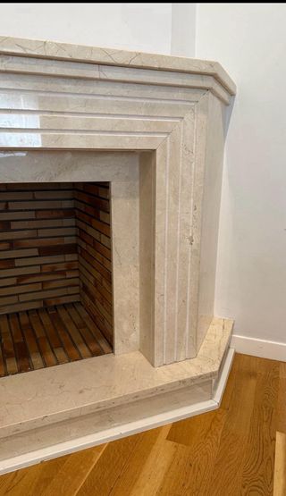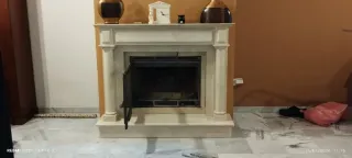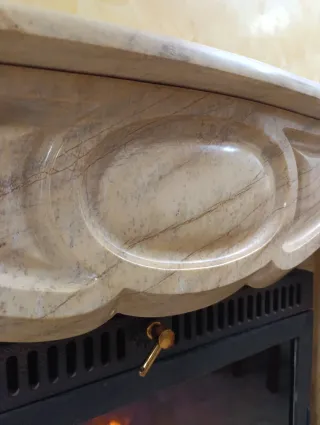 Elegante chimenea con embocadura de mármol en tonos beige. Un elemento decorativo que aportará calidez a tu hogar. - Diseño clásico y atemporal. - Materiales de marmol piedra natural. Actualmente esta desmontada la chimenea, y la embocadura también. Las medidas son de la embocadura de marmol. Las medidas de la chimenea ,74 ancho, 50 fondo ,58 alto