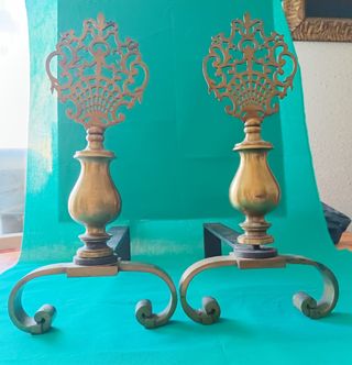 Par de morillos decorativas para chimenea, hierro y laton dorado. Aportan un toque clásico y elegante a tu hogar. Antiguo y muy bonito - Diseño con base de metal negro y remate superior laton dorado. - Estructura metálica robusta.