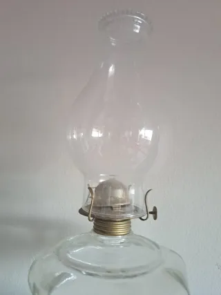 Lámpara de aceite de cristal con detalles metálicos. - Diseño clásico y elegante. - Base ancha para mayor estabilidad. - Chimenea de cristal. - Mecanismo para la mecha.