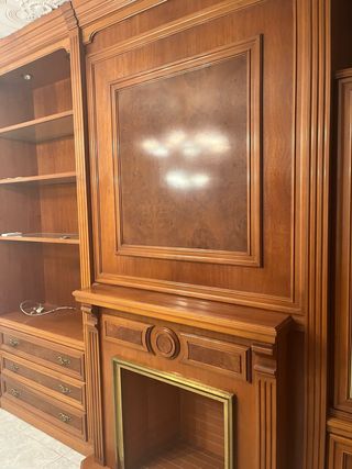 Elegante librería de madera con un diseño clásico y acabados detallados. Perfecta para organizar libros y objetos decorativos. - Estructura robusta de madera. - Paneles decorativos con veta. - Chimenea integrada con detalles ornamentales. - Cajones con tiradores dorados.