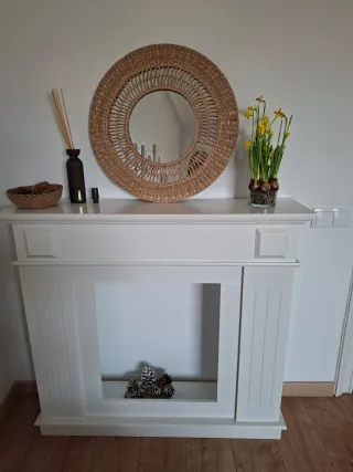 Preciosa chimenea decorativa que aportará un toque cálido y acogedor a tu hogar. Su diseño combina materiales naturales para un estilo único. Estructura principal en madera blanca. Vendida sin decoración y sin espejo. No hago envios