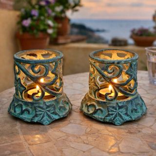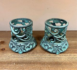 Pareja de portavelas decorativos en metal no magnético (aleación tipo zamak/aluminio), con rica decoración vegetal de hojas y roleos, así como una increíble pátina verde efecto envejecido. Diseño calado que realza la luz de la vela. Medidas aprox.: 8,5 cm de alto, base 10 cm de diámetro y boca interior 5,9 cm (ideal para velas tipo tealight o votivas). Estilo clásico–mediterráneo, perfectos para mesa, chimenea o aparador. Buen estado general con pátina intencionada.