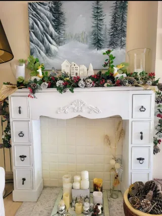 Chimenea decorativa de madera blanca estilo frances,con cajones y tiradores de metal.Como se ve en fotos decorativa e para cualquier estación del año,lo del frontal es un papel decorativo,se lo he quitado, se puede poner lo q se quiera o nada apoyada a la pared.Mando otra marron para coger idea de lo q se puede hacer si se quiere.Las medidas son,1,20 de ancha × 95 de alta y fondo 23c. El precio 100€. No se hacen envíos esta en Alicante.