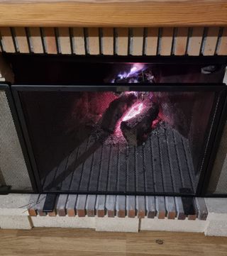 Salvachispas de chimeneas de acero, marca El Zorro, de Imex. Medidas: 109 cm de ancho (la zona central mide 68 cm y cada lateral 20,5 cm), 53 cm de altura y 2 cm de profundidad (las patas miden 13 cm). El juego de chimenea mide 68cm de altura y unos 28 cm de base