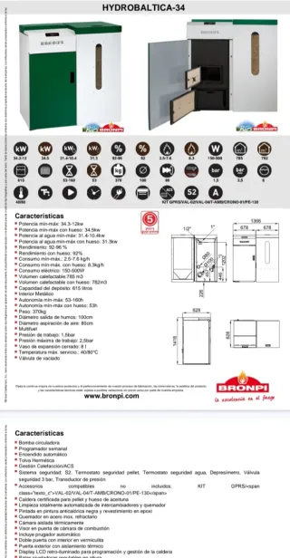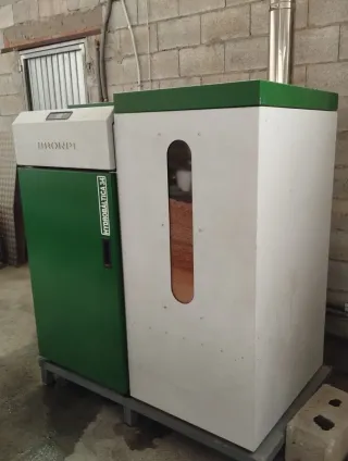 Caldera de biomasa Brompi modelo Hidro Báltica 34. Funciona con hueso y pellets. Se entrega también chimenea de salida de gases y el depósito de inercia que había montado en la instalación.