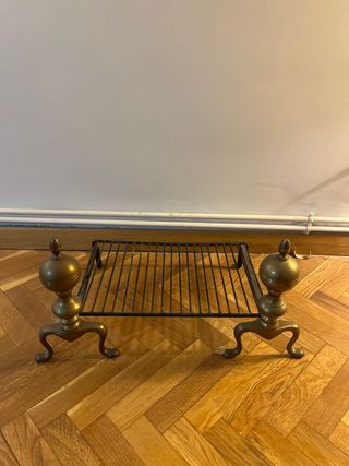 Este accesorio de chimenea aporta un toque elegante a tu hogar. - Diseño con patas curvas. - Rejilla metálica. - Acabado dorado y negro. Lamparrilla hace 41x29 y con las patas la superficie que abarca es de 56x33 Altura soportes de 30cm