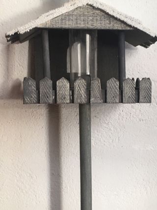 Comedero pájaros 21 de largo 20 alto hasta chimenea Ancho 12 Altura con palo 74 Se desmonta el palo El palo es para poderlo clavar en el césped Precio 18 euros