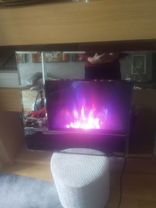 Marco en espejo biselado ,llamas decorativas en azul ,rojo y naranja, dos niveles de potencia y marcaje de tiempo y temperatura,es decorativa sobretodo y no una fuente calorífica como tal ,modifica un grado o dos la temperatura tras una hora de programación. Vendo porq no me cabe en el hueco de armario