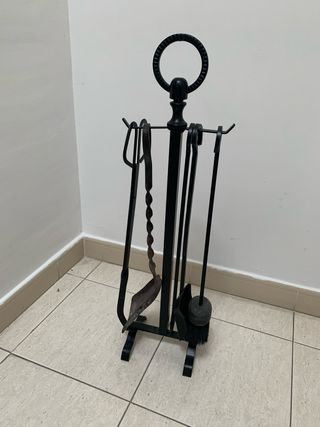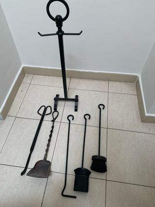 Juego antiguo de accesorios para chimenea, en metal. Ideal para añadir un toque rústico a tu hogar. - Incluye 5 piezas: atizador, pala, cepillo, recogedor y un soporte. - Las piezas presentan un aspecto antiguo y desgastado, lo que les da un encanto especial. - El soporte es de metal negro y tiene un diseño elegante.