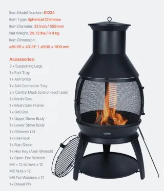 Chimenea de leña VEVOR para uso en exteriores. Su diseño es moderno y funcional. - Fabricada en metal y plástico resistente. - Color negro elegante. Completamente nueva en su caja original y sin estrenar.