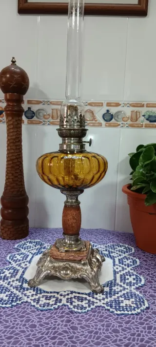 Elegante lámpara de aceite de procedencia francesa, datada en el siglo XIX. Su diseño es un reflejo del estilo de la época. - Base de mármol y metal plateado. - Cuerpo de cristal ámbar. - Quemador metálico con chimenea de cristal.