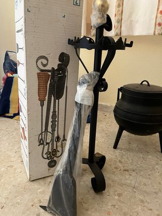Elegante conjunto de accesorios para chimenea. - Incluye soporte para herramientas. - Diseño clásico en forja. - Acabado en color negro y detalles dorados. Esta nuevo con etiqueta. Solo falta el soplador.