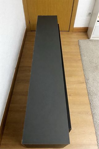 Mueble de diseño moderno que combina funcionalidad y estilo. - Acabado en negro y gris. - Estructura principal de metal. - Detalles decorativos de piedra.