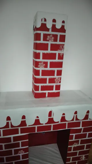 Chimenea decorativa de cartón, perfecta para ambientar tu hogar en Navidad. Su diseño imita ladrillos rojos con detalles blancos. - Adornada con copos de nieve. - Incluye una imagen de Papá Noel en el interior.