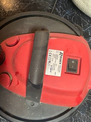 Aspiradora para chimenea con un diseño llamativo. - Cubierta de metal con acabado de fibra de carbono. - Tapa superior de plástico rojo.