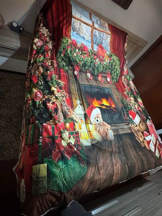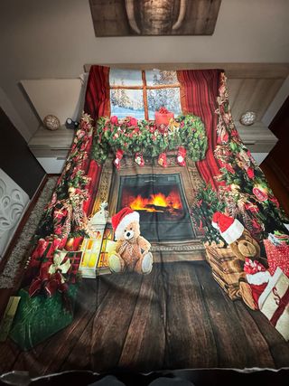 Tela de terciopelo con un diseño navideño para fotografía. Representa una chimenea encendida, un oso de peluche con gorro de Papá Noel, regalos y un paisaje nevado. - Diseño festivo de Navidad. - Ideal para crear ambientes acogedores en fotos. medidas aprox 200x200