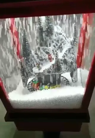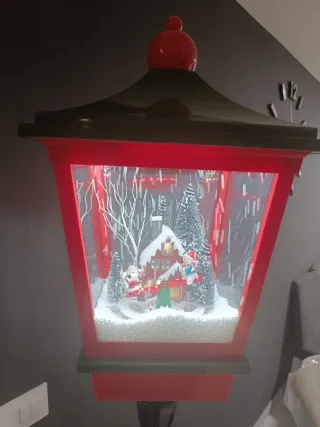 Farola decorativa con temática navideña, ideal para ambientar tus fiestas. Primera temática balancín Papa Noel y Muñeco de Nieve. Segunda temática Papa Noel en la Chimenea. Tercera temática locomotora entre la montaña y los niños jugando con la nieve. Tenemos stock. Puedo enviar más info. - Diseño de casita con figuras. - Escena interior con nieve y árboles.
