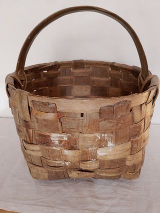 Cesta artesanal con asa, elaborada con tiras de madera de castaño. Necesita una restauración, pero es preciosa para tener la leña de la chimenea. Medidas aproximadas: 30 cm de ancho x 28 cm de alta.