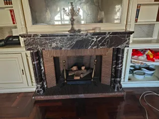 Elegante chimenea con detalles en mármol - Diseño clásico con repisa de mármol veteado. - Pilastras de madera oscura. - Hogar con rejilla metálica.