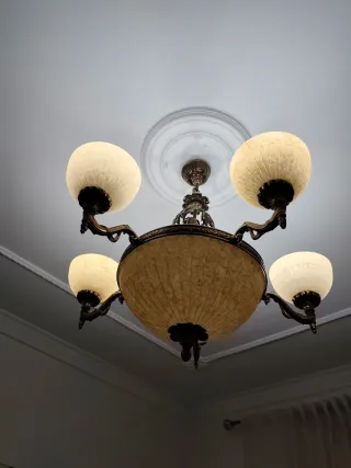 Elegante lámpara de techo para salón con un diseño clásico. - Acabado en tonos dorados y beige. - Combina detalles metálicos y de cristal.