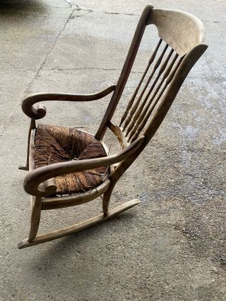 Este sillón mecedora antiguo aporta un toque rústico y clásico a cualquier espacio. Su diseño tradicional lo convierte en una pieza decorativa. - Fabricado en madera, para restaurar, tiene agujeros de polilla antigua.