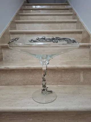 Elegante centro de mesa con un diseño decorativo. - Base y pie de cristal transparente. - Adornos de estaño puro 95%, con acabado plateado. - Diseño inspirado en ramas y frutos.