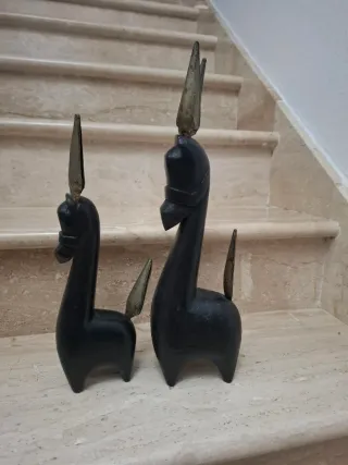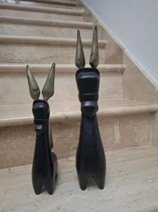 Conjunto de dos figuras decorativas con un diseño elegante. - Elaboradas en madera y metal. - Acabado en color negro y detalles dorados.