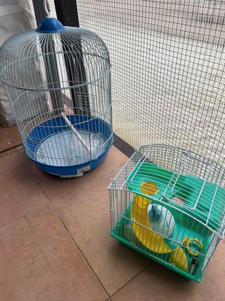 Se venden dos jaulas, una para pájaros y otra para hámster. - Jaula de pájaros con base azul. - Jaula de hámster con accesorios verdes y amarillos.