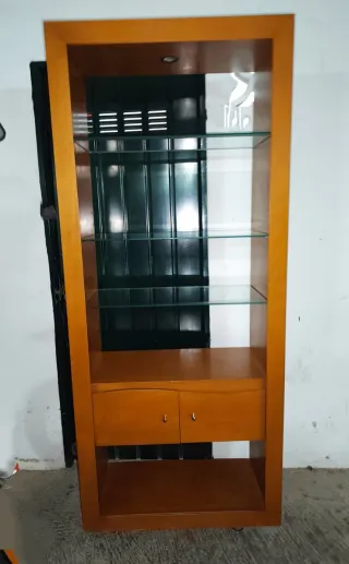 Mueble expositor de madera con estantes de cristal Diseño moderno y elegante. Muy buena calidad Con ruedas y luz interior . pequeñas marcas de uso con buen estado en general .