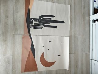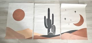 Conjunto de tres láminas decorativas con un diseño moderno y minimalista, Láminas decorativas estilo boho. - Motivos de paisaje desértico y elementos celestes. - Tonos tierra y beige. - Ideales para crear un ambiente cálido y relajado. TAMAÑO: 50 x 70 cm