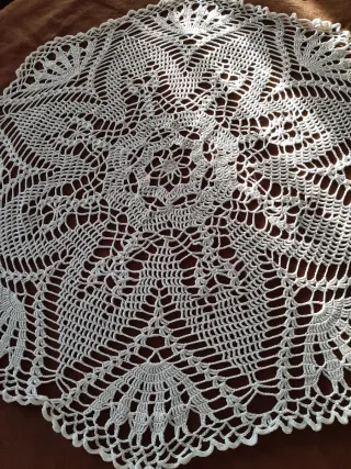Precioso tapete de crochet de forma redondeada. Ideal para decorar cualquier espacio o como centro de mesa. - Diseño intrincado y delicado. - Acabado artesanal. - Mide 75x75. - Como nuevo.