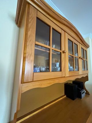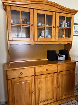 Mueble de salón ,nuevo,con acabado en pino color miel. Cuenta con puertas de cristal y espacio de almacenamiento. - Diseño clásico y elegante. - Tiradores de madera.