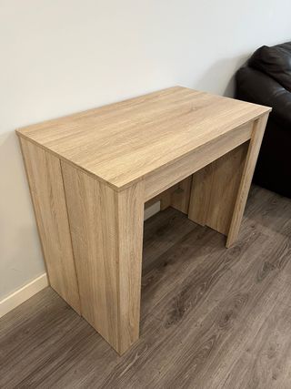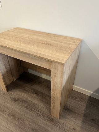 Mesa consola extensible con acabado en color roble canadiense.Su diseño se adapta a diferentes espacios. Cerrada mide 90x50cm. Tiene 4 tableros adicionales , puede llegar hasta 90x237 cm . Para 10 comensales. Sólo entrega en persona, en Madrid