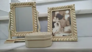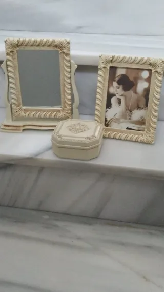 Conjunto de tocador con espejo, joyero y marco de fotos. - Espejo de sobremesa con marco decorado. Medidas 26 alto 25 ancho. - Joyero cuadrado con tapa y diseño ornamentado. Medidas 12.5 x 12.5. Alto 5.5 - Marco de fotos decorado. 22 alto x 17 ancho.